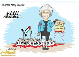 The cartoon shows British Prime Minister Theresa May holding an Israeli flag and a document labeled “Balfour Declaration,” which is dripping blood. In the background are lying skulls in a pool of blood with skeleton hands rising from among them holding a key symbolizing the right of return of the Palestinian refugees, and a Palestinian flag.