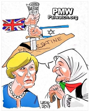 The cartoon shows an elderly Palestinian woman with a Palestinian flag on her shirt speaking to British Prime Minister Theresa May. UK and Israeli flags are stabbing a knife into the PA map labeled "Palestine" that presents all of Israel as "Palestine" together with the PA areas. The handle of the knife consists of a document, on which "Balfour 1917" is written.