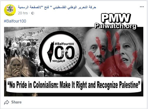 "The Fatah Movement said that the ominous [Balfour] Promise (i.e., Declaration) that Britain gave the Jews 100 years ago is an invalid promise, and that they do not have a right to the land of Palestine so as to be able to promise it to others.