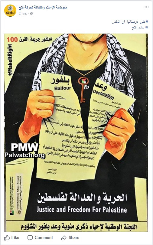 Fatah posts image of man ripping apart Balfour Declaration with text “Britain needs to apologize”