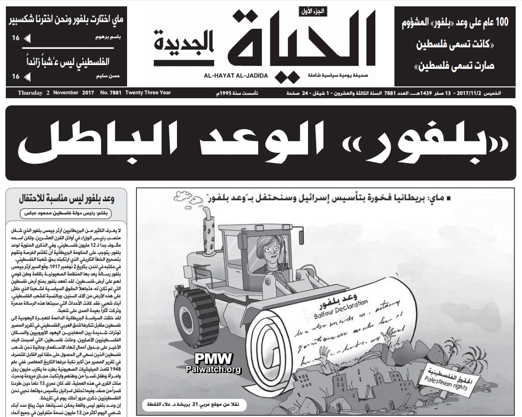 To mark the occasion of the 100 year anniversary of the Balfour Declaration, all official PA print media, WAFA and the official PA daily, including its front page, came out only in black. PA TV news readers and reporters all wore black. The front page of the official PA daily, Al-Hayat Al-Jadida, had a giant headline: "The null and void promise"