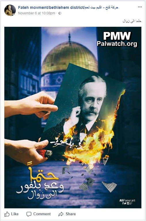 Text and image posted on the Facebook page of the Fatah Movement – Bethlehem Branch. The image shows a picture of British Foreign Secretary Arthur Balfour being held as it goes up in flames. In the background is the Dome of the Rock.