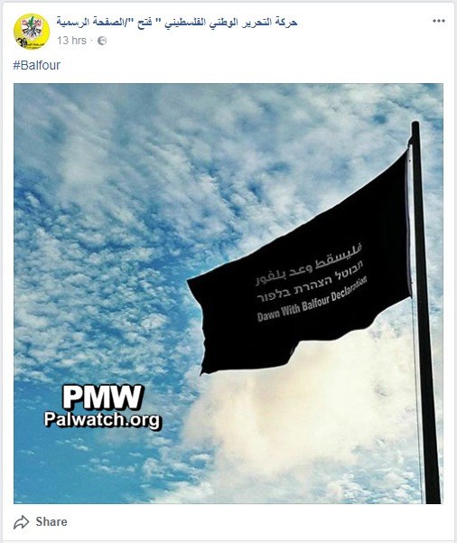 Fatah also posted a black flag with the text "Dawn (sic., down) With Balfour Declaration" written on it in Arabic, Hebrew, and English. In Arabic, "Promise" is written instead of "Declaration." Posted text: "#Balfour" [Official Fatah Facebook page, Nov. 1, 2017]