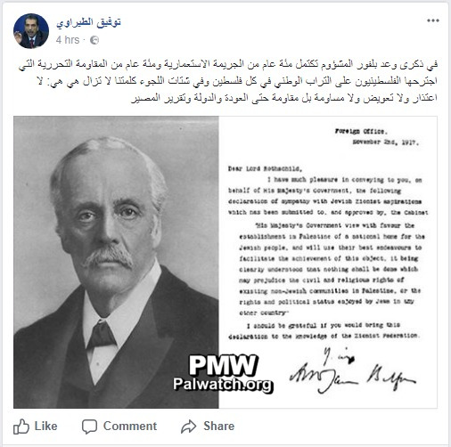 Fatah Central Committee member Tawfiq Tirawi concurred in a post on Facebook where he called for continued "resistance":Posted text: "This anniversary of the ominous Balfour Promise (i.e., Declaration) marks 100 years since the colonialist crime and the liberation resistance that the Palestinians have been forced to carry out on the homeland in all of Palestine and the diaspora, [and] our statement still remains the same: 'No to apology, no to compensation, and no to compromise, rather resistance until the return [of the refugees], the state, and self-determination.'"