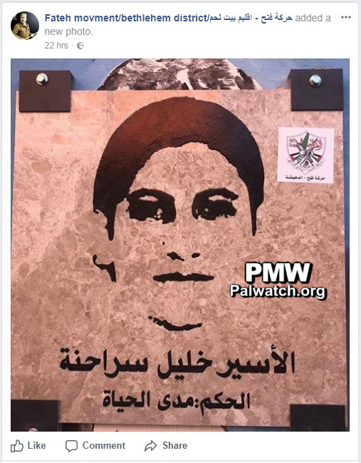 Text on image: “Prisoner Khalil Sarahneh (i.e., terrorist, participated in murder of 1)