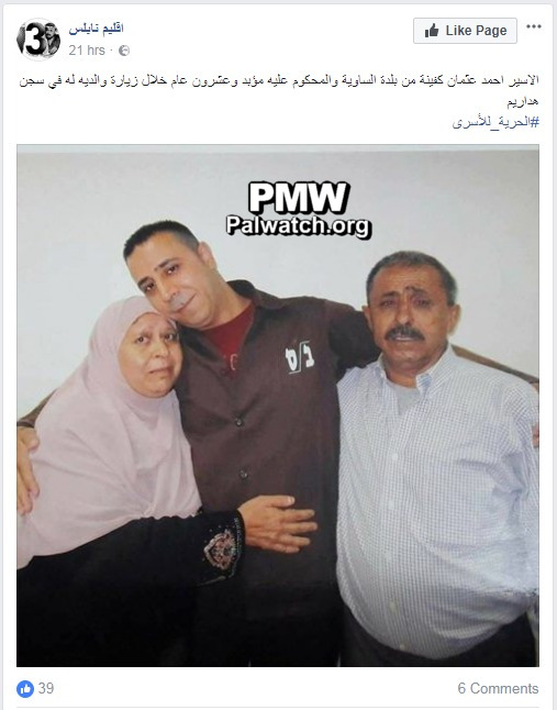 Posted text: “Prisoner Ahmad Othman Kafina (i.e., terrorist, murdered 1) from the village of Al-Sawiya, who is sentenced to life and another 20 years, during a visit by his parents at the Hadarim Prison