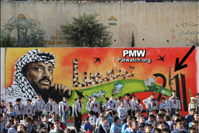 The image shows a wall mural at a PA school in Nablus. The mural includes a drawing of former PLO and PA Chairman Yasser Arafat wearing a keffiyeh. On the mural is written: “The keffiyeh unites us,” and at the start of the word “keffiyeh” appears a drawing of an AK-47 assault rifle (marked by an arrow) .