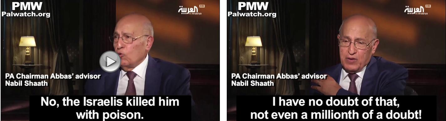 PA Chairman Mahmoud Abbas' advisor on Foreign Affairs and International Relations Nabil Shaath stated earlier this year that he knows for a fact - without "a millionth of a doubt" - that the Israelis killed Arafat "with poison":