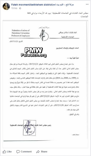 The image shows a letter from the Association of Palestinian University Unions, which includes the association’s logo. The logo features the PA map of “Palestine” that presents all of Israel as “Palestine” together with the PA areas.