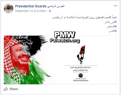 The PA Presidential Guards also emphasized the spilling of Palestinian blood in a post on its Facebook page: Posted text and text on image: