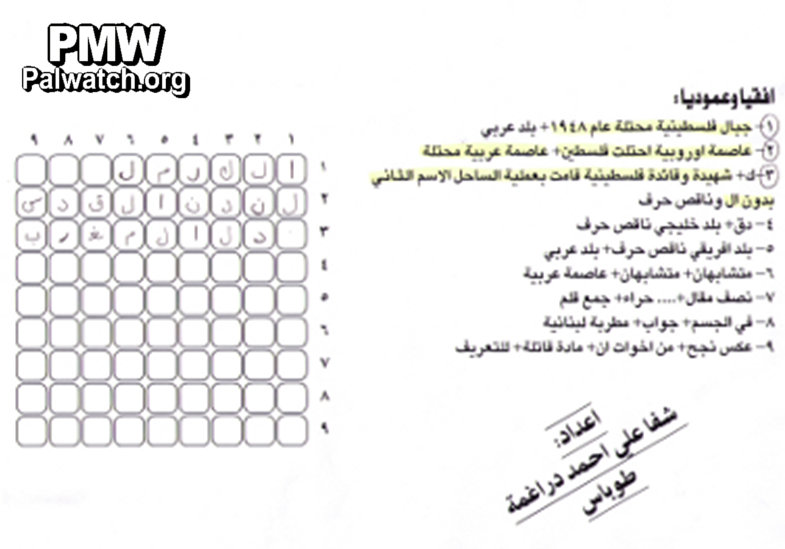 Palestinian Authority crossword: The Carmel (in Israel) is "occupied Palestinian mountains"Al-Hayat Al-Jadida, official PA daily |Aug 4, 2009Clue: "Occupied Palestinian mountains - 1948" Solution: "Carmel" (Haifa) Click to view bulletin » View analysis citing this item