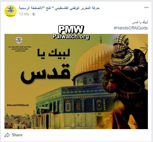 The image shows the Dome of the Rock, and a Palestinian masked in a keffiyeh (Arab headdress) armed with a machine gun. The upper left shows the Fatah logo that includes a grenade, crossed rifles, and the PA map of “Palestine” that presents all of Israel as “Palestine” together with the PA areas.