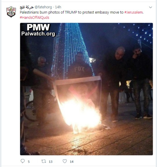 Fatah Twitter posts image of Palestinians burning photos of US President Trump to protest embassy move