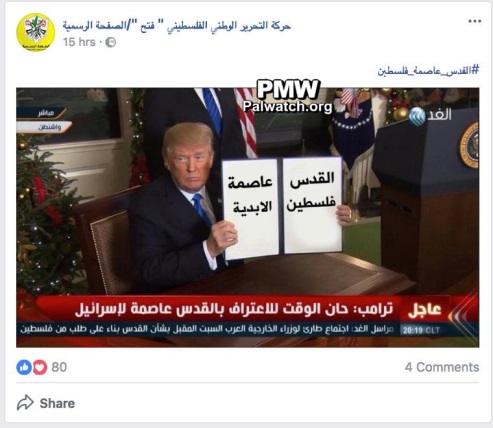On picture of Trump, Fatah replaces text of US memorandum declaring Jerusalem as Israel’s capital with "Jerusalem the eternal capital of Palestine"