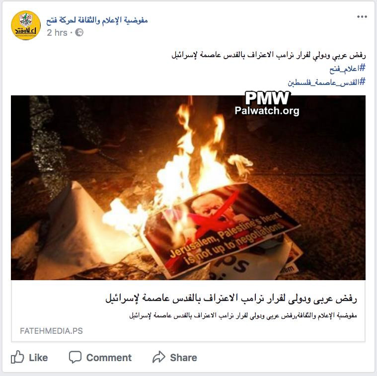Fatah posts burning picture of Trump with text: "Jerusalem, Palestine's heart is not up for negotiations"