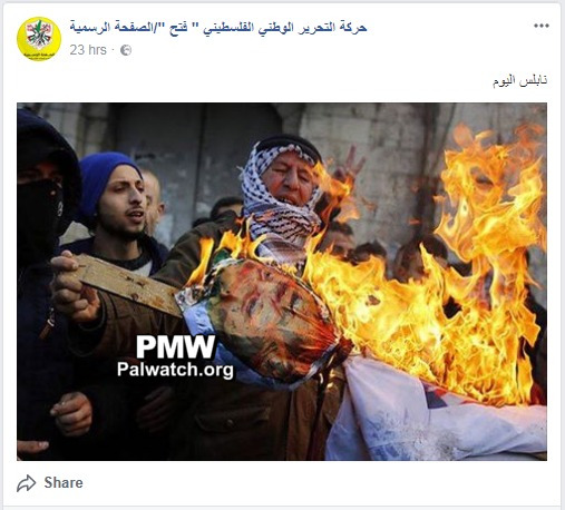 Palestinians burn an effigy of US President Trump, in image posted on Fatah Facebook page