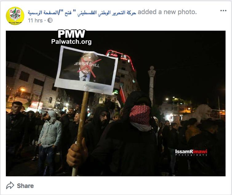 Another Fatah post showed people demonstrating against Trump, holding posters with Trump's picture on them with a red x over his face, and text in English over his face: "Jewish Shill" [Official Fatah Facebook page, Dec. 7, 2017]
