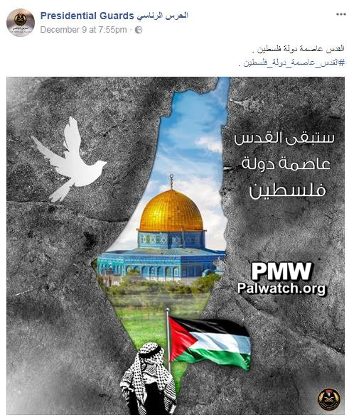 The image shows the PA map of “Palestine” that presents all of Israel as “Palestine” together with the PA areas, and in it is seen the Dome of the Rock. To the left of the map appears a dove, and standing in front of the map is a Palestinian wearing a keffiyeh (Arab headdress) and carrying a Palestinian flag. This is in response to US President Donald Trump’s decision to recognize Jerusalem as the capital of Israel and transfer the US embassy there.