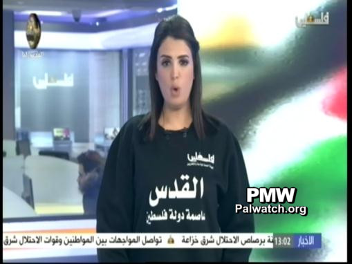Visual: The official PA TV newsreader is wearing a black shirt with the logo of the official PA TV channel on it and the text: “Jerusalem – the capital of the State of Palestine.”