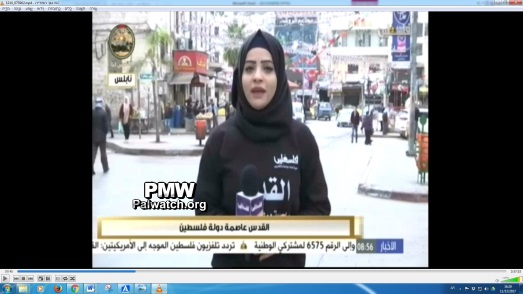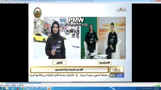 The screenshots show the PA TV hosts and reporters wearing black shirts with the logo of the official PA TV channel on them and the text: “Jerusalem – the capital of the State of Palestine.” This is in response to US President Donald Trump's decision to recognize Israel as the capital of Jerusalem and to move the US embassy there.