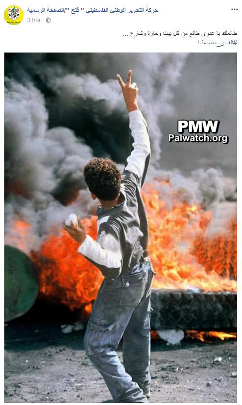 Fatah Facebook promotes violence with image of stone-throwing boy with lyrics from terror-promoting song: “I am coming towards you, my enemy, from every home, neighborhood, and street“