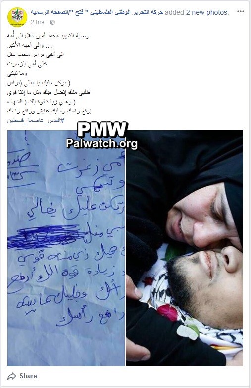 Fatah Facebook posts will of terrorist: “Let my mother make sounds of joy and do not cry”