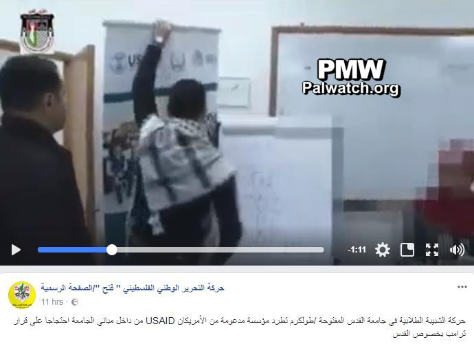 Posted text: “The [Fatah] Shabiba Student Movement at Al-Quds Open University in Tulkarem expels an institution supported by the Americans – USAID – from the university buildings in protest of [US President Donald] Trump’s decision regarding Jerusalem [recognizing it as Israel’s capital].”
