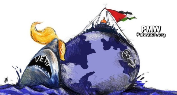The cartoon shows US President Donald Trump depicted as a shark with “veto” written in its mouth as it rams into a ship in the shape of the world. On the top of the world appears the Dome of the Rock and other buildings representing Jerusalem, and a Palestinian flag is flying from its masts. The cartoon refers to a US veto on a UN Security Council vote on Dec. 19, 2017, which rejected Trump’s recognition of Jerusalem as Israel’s capital. The UN General Assembly later passed a similar resolution of rejection on Dec. 21, 2017.