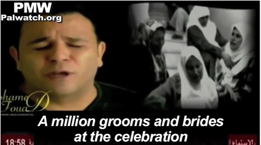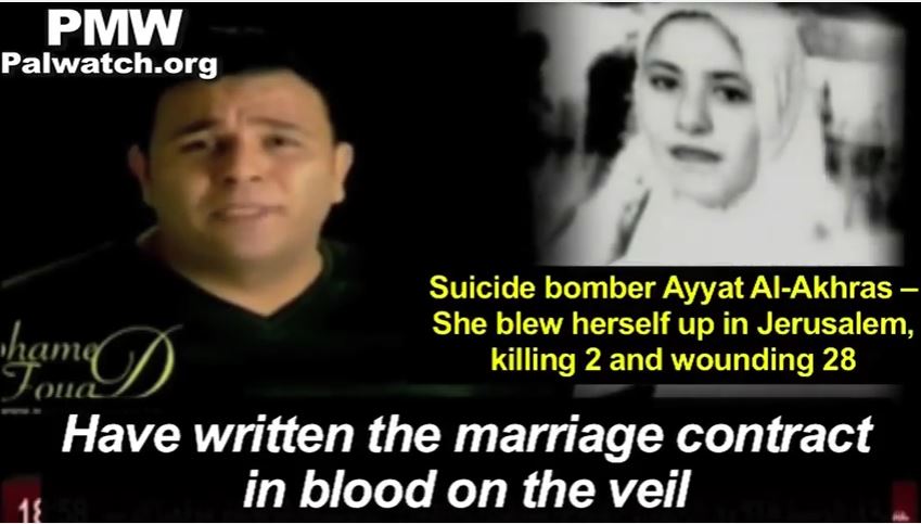 PA TV has broadcast this music video at least twice since Trump's Jerusalem announcement. The song calls on Palestinians to become “Martyrs” for the Al-Aqsa Mosque and includes two photos of female suicide bombers Wafa Idris and Ayyat Al-Akhras who murdered 3 and wounded 128. The lyrics remind Palestinians of the Islamic belief that male Martyrs marry 72 dark eyed virgins in Paradise, stating their “marriage contracts” have been “written in blood”: