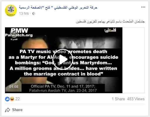 In response, Fatah posted on its official Facebook page PMW's subtitled video from PA TV, stating that "Gendelman, Netanyahu's spokesman, attacks PA TV" [Official Fatah Facebook page, Dec. 20, 2017]