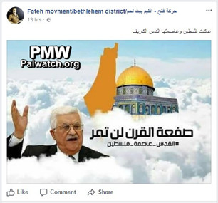 The image shows PA Chairman Mahmoud Abbas in the clouds, and above him to the right the Dome of the Rock and the PA map of “Palestine” that presents all of Israel as “Palestine” together with the PA areas.