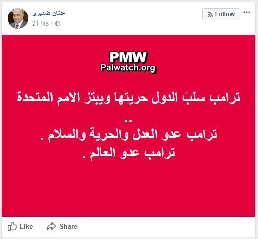 Palestinian Authority Security Forces spokesman: Trump is “the enemy of the world”