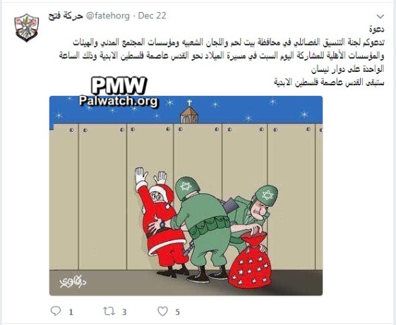 Cartoon on Fatah Twitter depicts Israeli soldiers searching Santa