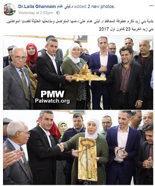 Posted text: “The Bani Zeid Municipality honors District Governor [of Ramallah and El-Bireh] Dr. Laila Ghannam for her constant support for and intensive taking care of the residents’ affairs.”