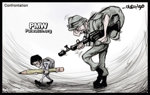 Cartoon in official Palestinian Authority daily shows Israeli soldier pointing an assault rifle at a young Palestinian schoolboy