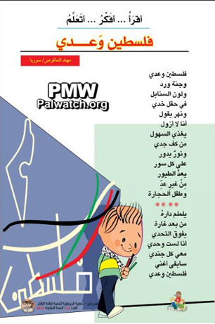 The poem appears with a drawing of a boy wearing a keffiyeh (Arab headdress) and holding crayons. On the wall behind him is drawn the PA map of “Palestine” that presents all of Israel as “Palestine” together with the PA areas, and below it are the colors of the Palestinian flag and the word “Palestine.”