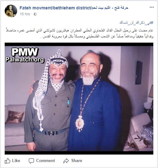 Fatah Facebook Bethlehem branch praises weapons smuggler, former Archbishop of Jerusalem Capucci