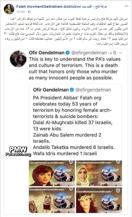 “Israel accuses the Fatah Movement and [PA] President [Mahmoud Abbas] of sponsoring the culture of death by supporting the families of the Martyrs (Shahids) and commemorating them.”
