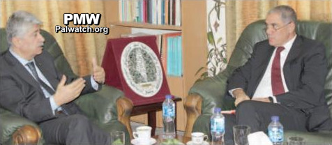 The article includes a picture from the meeting between PLO Executive Committee member and Secretary-General of the Palestinian Popular Struggle Front (PPSF) Dr. Ahmed Majdalani and EU Representative in Palestine Ralph Tarraf. Between the two a decorative plate is seen featuring the PA map of “Palestine” that presents all of Israel as “Palestine” together with the PA areas.