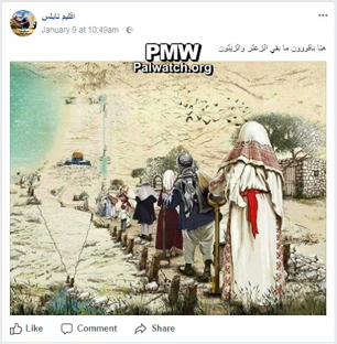 The image shows the PA map of “Palestine” that presents all of Israel as “Palestine” together with the PA areas, with the Dome of the Rock seen at the location of Jerusalem. People in Arab clothing are walking along a path that leads to Jerusalem.