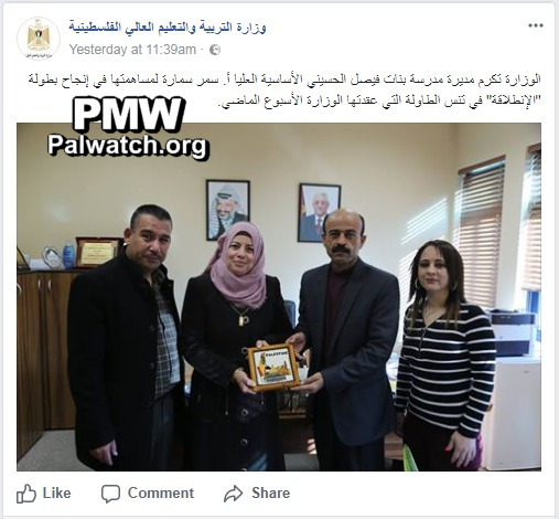 Palestinian Authority Ministry of Education awards plaque with map of “Palestine” to principal of school named after terror leader