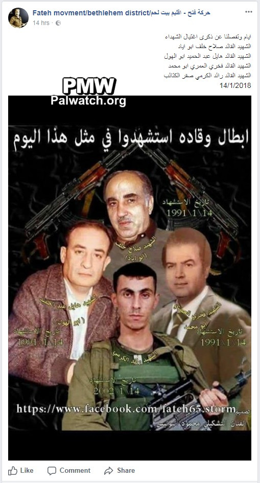 Abbas’ Fatah glorifies terrorist murderer of 9 and members of terror group on its Facebook page, with photo showing the terrorists behind crossed rifles