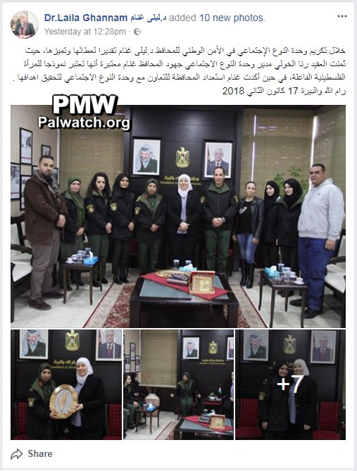 Posted text: “During the tribute held by the gender unit of the [PA] National Security [Forces] for District Governor [of Ramallah and El-Bireh] Dr. Laila Ghannam, as a sign of appreciation for her giving and excellence.”