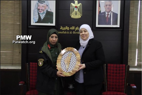The image shows a female member of the PA Security Forces presenting District Governor of Ramallah and El-Bireh Laila Ghannam with an honorary plaque featuring the PA map of “Palestine” that presents all of Israel as “Palestine” together with the PA areas, with a Palestinian flag on it and a keffiyeh (Arab headdress) pattern in the background.