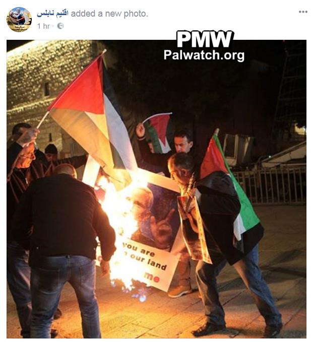 Image on official Facebook page of Fatah Movement – Nablus branch people people burning a picture of US Vice President Mike Pence, waving Palestinian flags