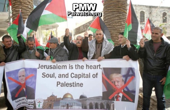 The article includes a picture from the vigil in which participants are waving Palestinian flags and holding a poster showing pictures of US President Donald Trump and US Vice President Mike Pence with red “X”s over them, and pictures of the Church of the Holy Sepulcher, the Dome of the Rock Mosque, and the Al-Aqsa Mosque in between them. In the bottom left corner of the poster is the PLO logo that features a flame, the Palestinian flag, and the PA map of “Palestine” that presents all of Israel as “Palestine” together with the PA areas. Text on logo: “The Palestinian Liberation Organization