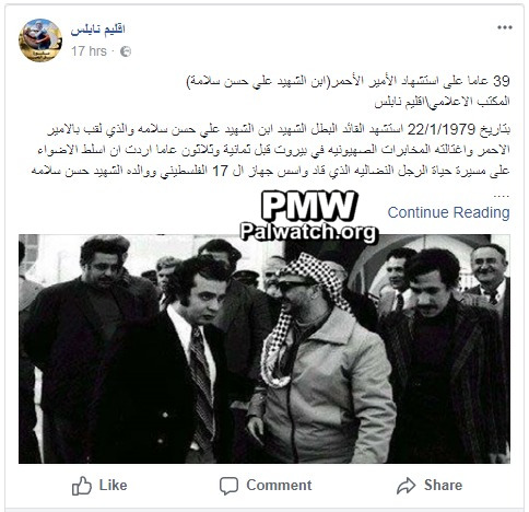 “Thirty-nine years since the death as a Martyr (Shahid) of the Red Prince [Ali Hassan Salameh] (i.e., a commander of the Black September terror organization), the son of Martyr Hassan Salameh