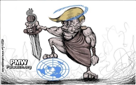 Cartoon published in official Palestinian Authority daily shows Trump threatening the UN logo with a dollar sign sword