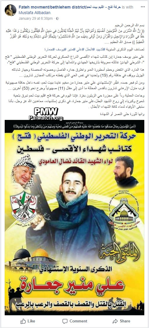 The operation came in response to a massacre in the Al-Zeitouna neighborhood in Gaza (sic., a day before the suicide bombing Israeli forces came under fire and killed 8, at least 3 of them Islamic Jihad terrorists). Today we in the Bethlehem branch of the Fatah Movement send a blessing of honor and admiration to the soul of heroic Martyr Ali Munir Ja’ara on the anniversary of his death as a Martyr, and we vow to Almighty Allah that we will continue to be loyal to the blood of all of the heroic Martyrs.
