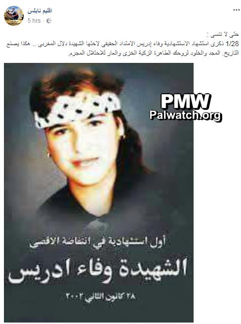 Jan. 28 is the anniversary of the death as a Martyr (Shahid) of the female Martyrdom-seeker Wafa Idris (i.e., suicide bomber, murdered 1 and wounded over 100), the true successor of sister Martyr Dalal Mughrabi (i.e., terrorist who led murder of 37, 12 of them children). This is how history is made. Eternity and glory to your pure soul, and shame and disgrace to the criminal occupation.”